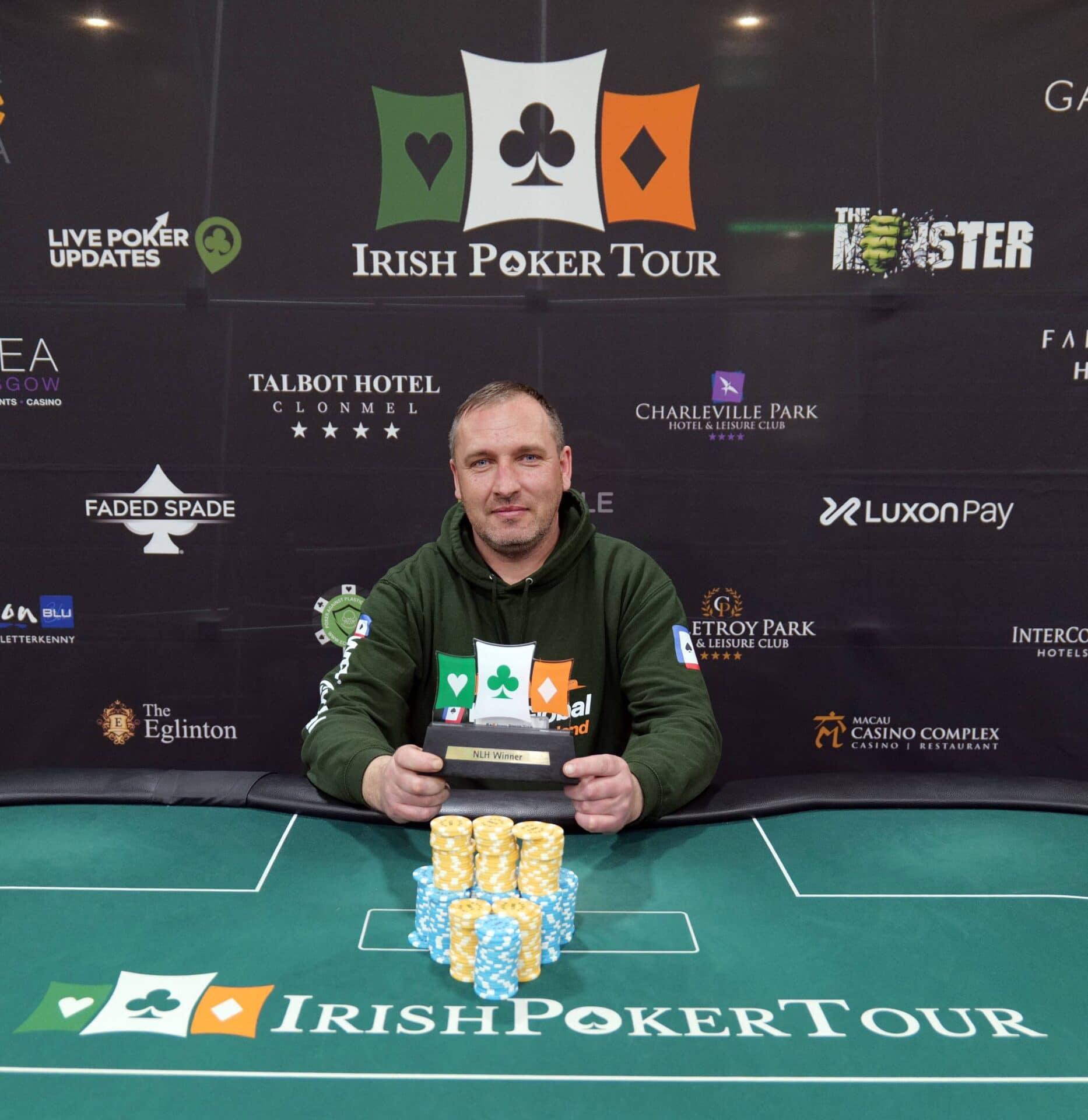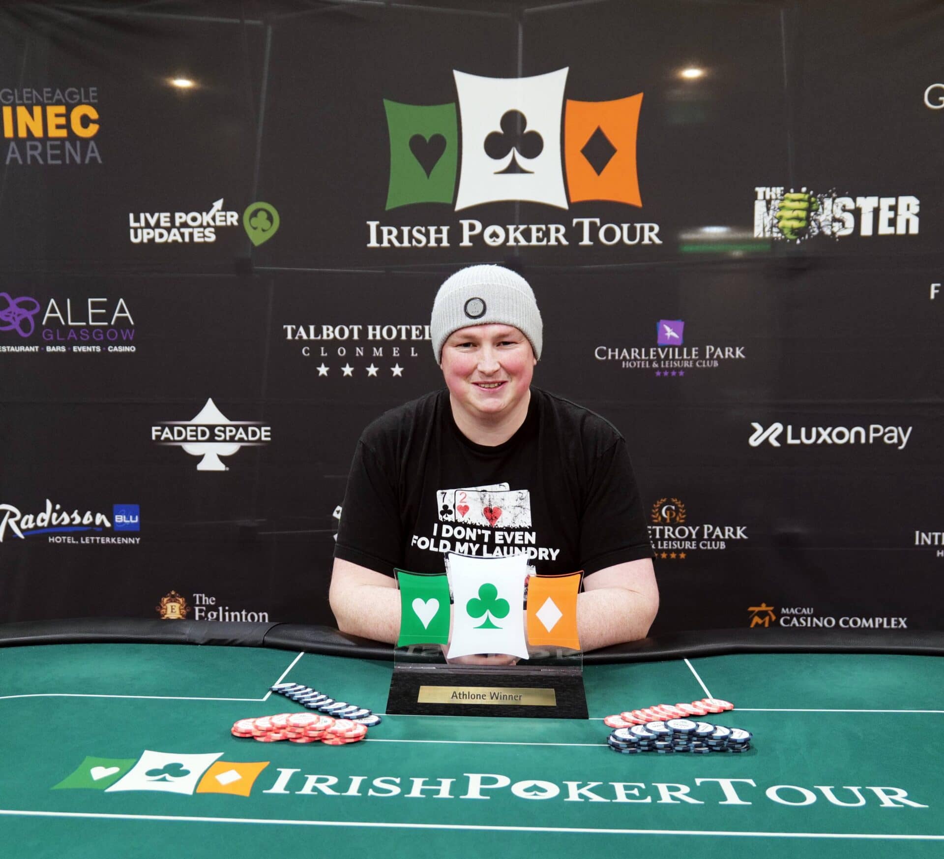 Killian Farrell has won the Main Event at Athlone’s €30k in a day after doing a deal heads up with Ronan Gilligan, once both players were even in chips. Killian walks away with the trophy and €8,100 after a deal heads up!