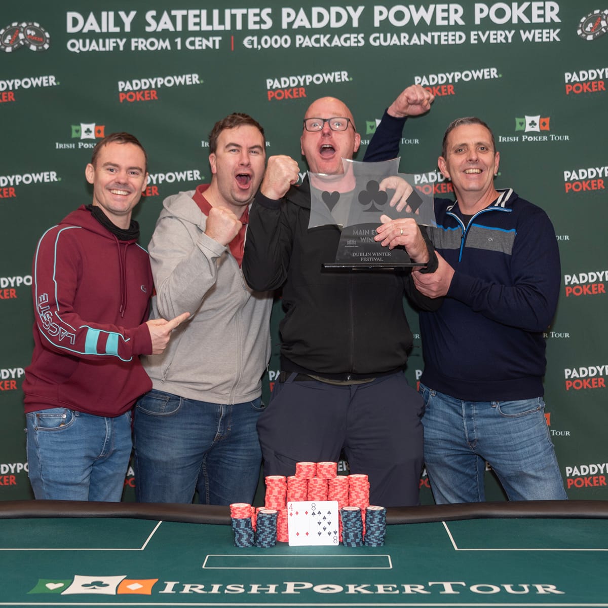 Hometown boy, Noel Murphy took the Dublin Winter Festival Main Event trophy and €19,875 after a five way deal last night. After a great battle where all players agreed that the tournament structure gave everyone a very fair chance, Noel, Derek Baker, Shane Keary, Keith Touhey and Peter Roche agreed to take €18,875 each and then play on for a €1,000 plus the glory.