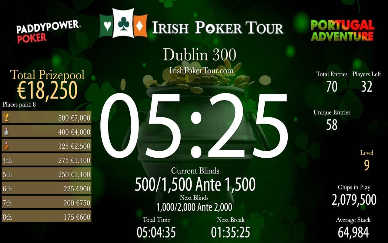 Total prizepool €18,250 Total Entries 70 Players remaining 32 1st place prize €7000 Places paid 8 Average stack 64,984 Reactions: ❤️ 0 😂 0 😮 0 🔥 0 😍 0 💯 0