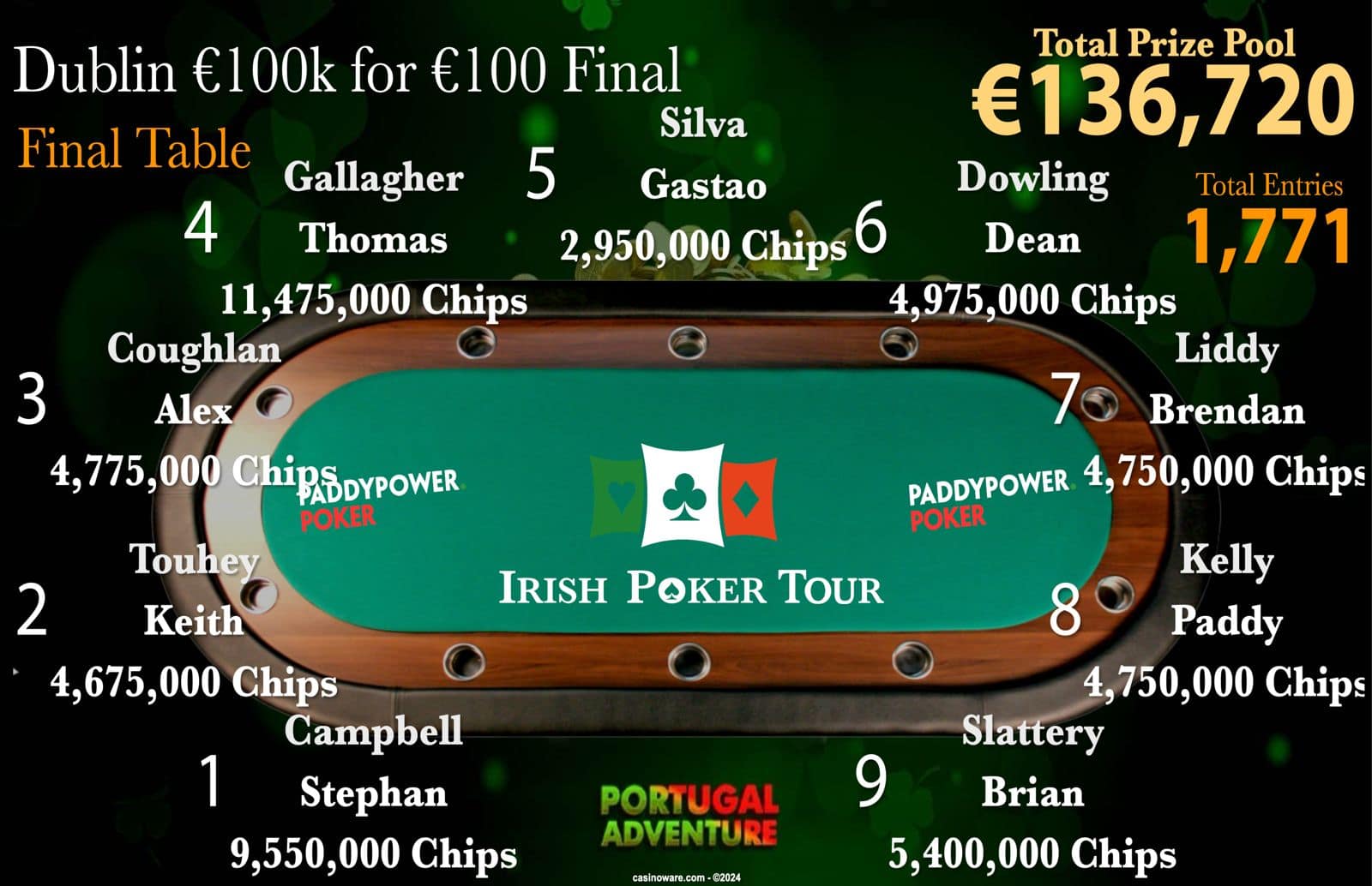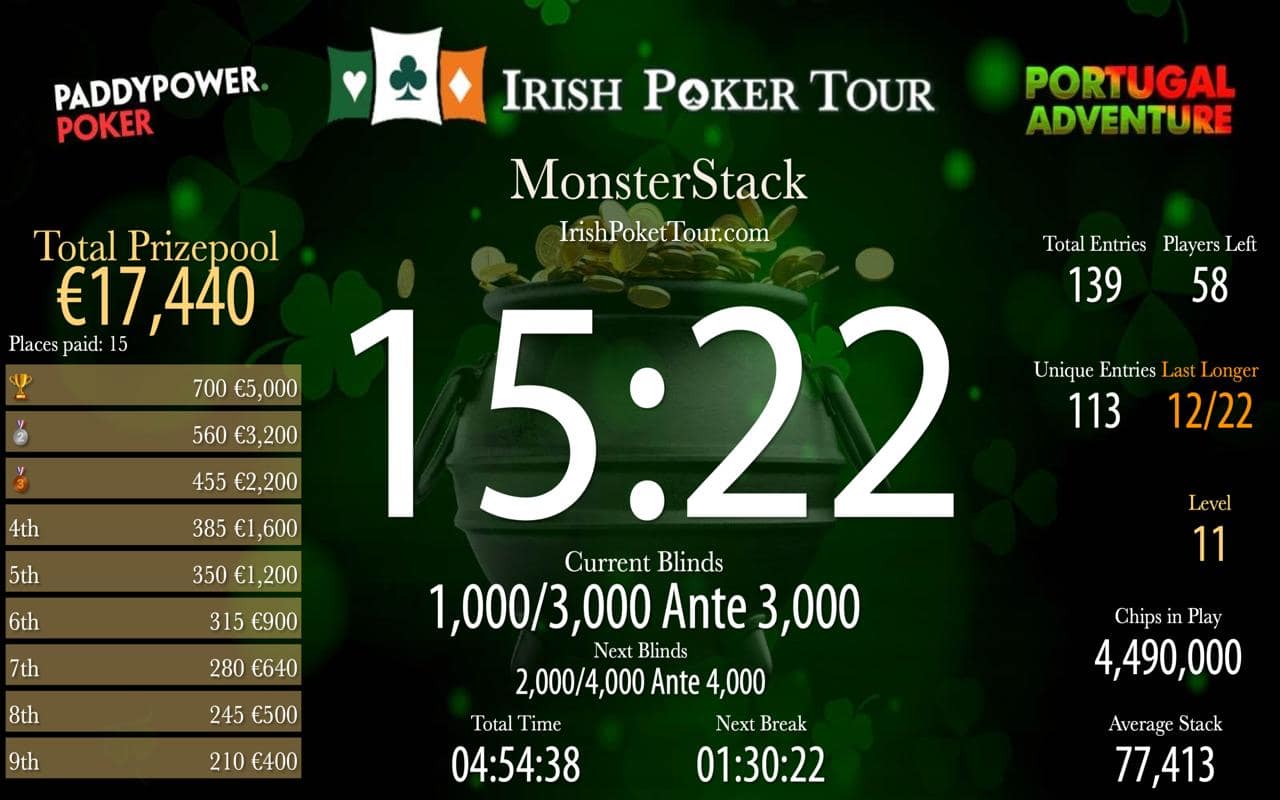 Thomas Gallagher is your chip leader heading into this years showpiece with 11.4 Million chips. An incredible main event will culminate in a €20,000 first prize.