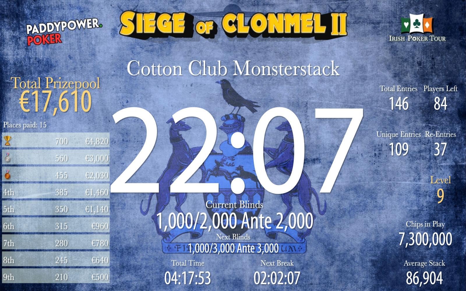Cotton Club Monsterstack had 146 entries creating a prizepool of €17,610!!! 68 Players left at the moment. 15 Players getting paid with €320 min cash and €4,820 at the top.