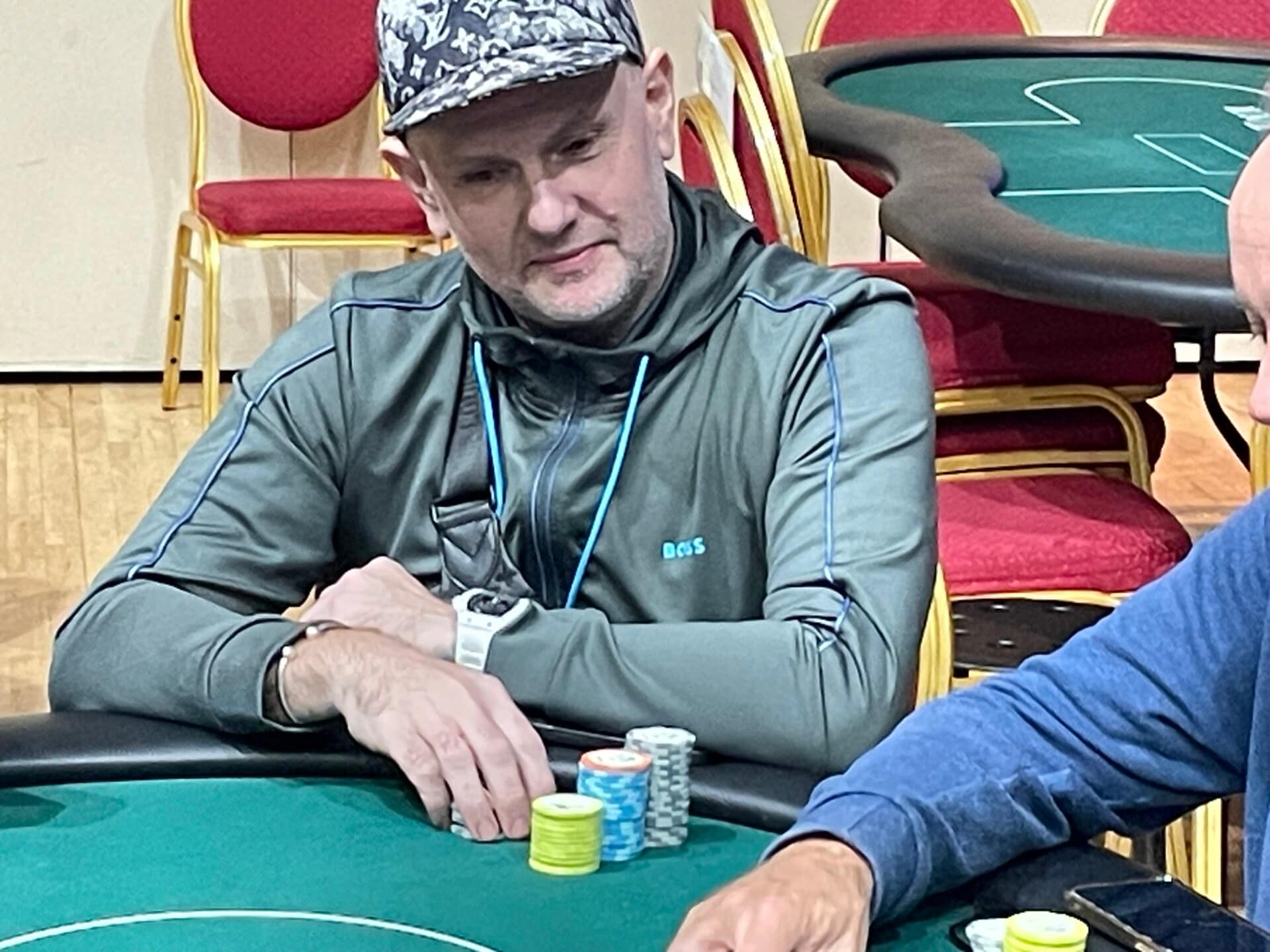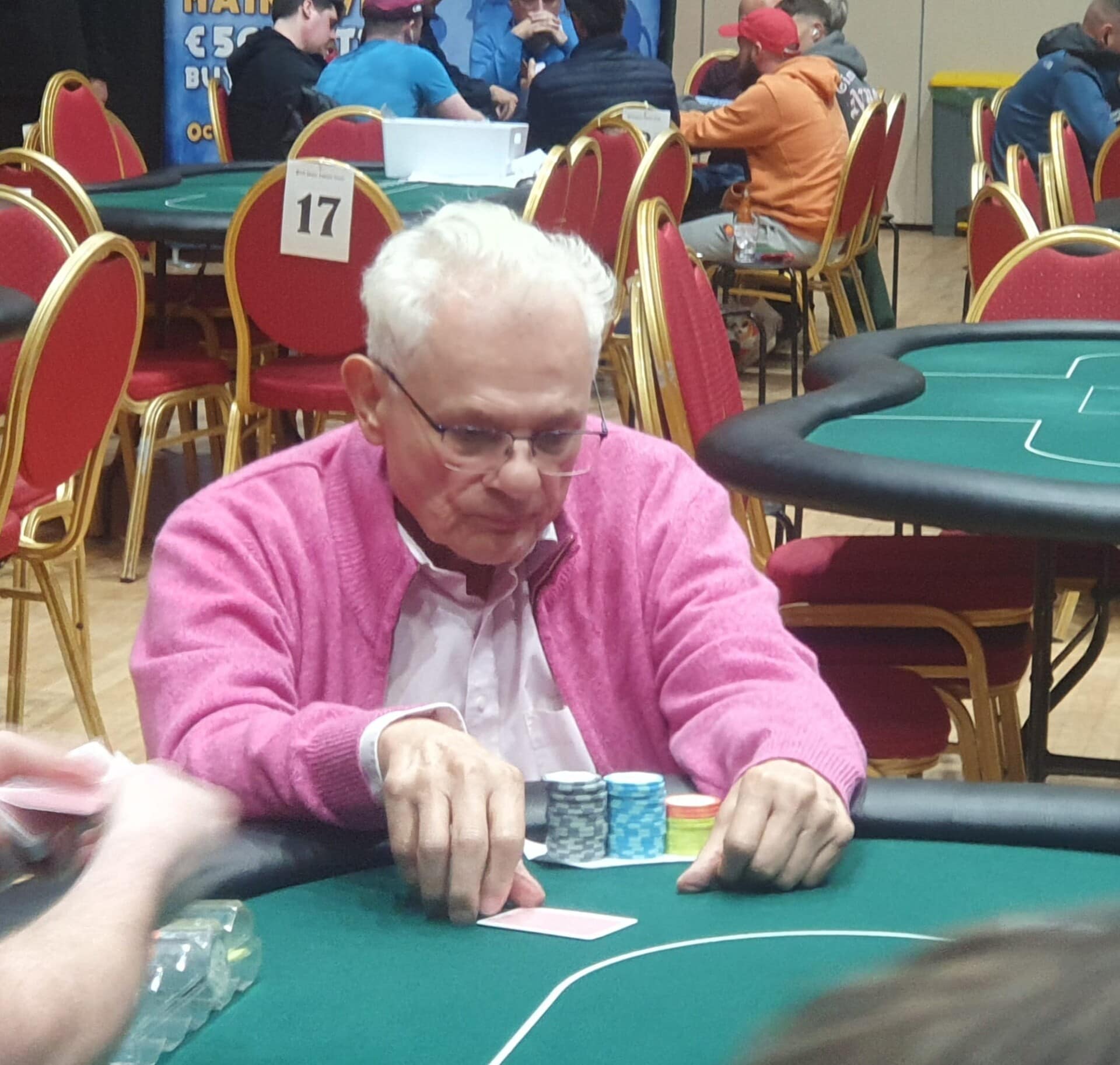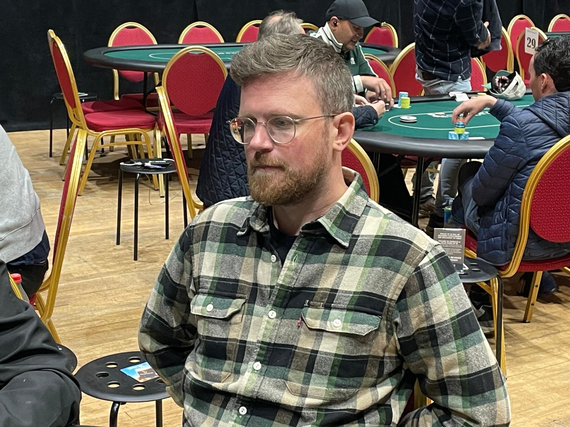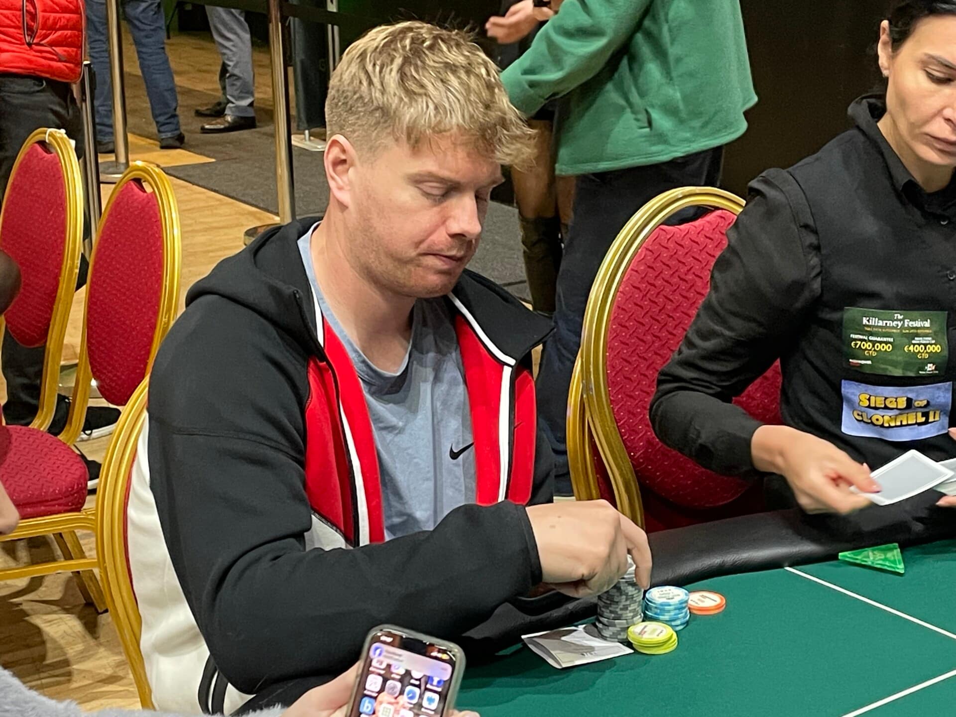 Irish poker legend Dara O’Kearney has joined the festivities here in Killarney, having jumped into the Mystery Bounty. He doesn’t have much to work with at present, but that has never concerned the short-stack master.